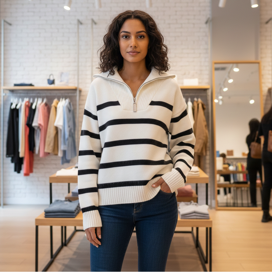 Élodie™ is een verfijnde trui die klassieke strepen combineert met subtiele contrastkleuren, waardoor ze een eigentijdse elegantie uitstraalt. Het halve rits-detail en de zachte breistructuur maken deze trui mooi draagbaar bij zowel casual als stijlvolle outfits.